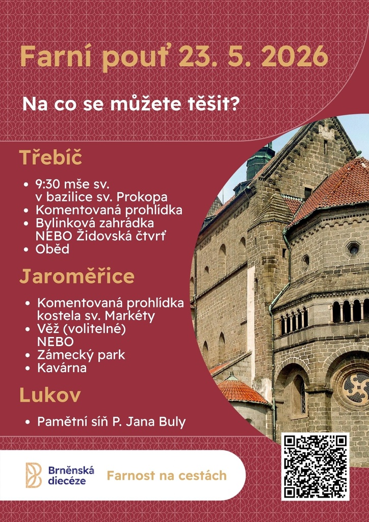 Přihlašování ZDE, nebo na archy v kostele/kapli. Platba na účet žebětínské části farnosti, VS 555. Odjezd autobusu 23. 5. 20267:30…